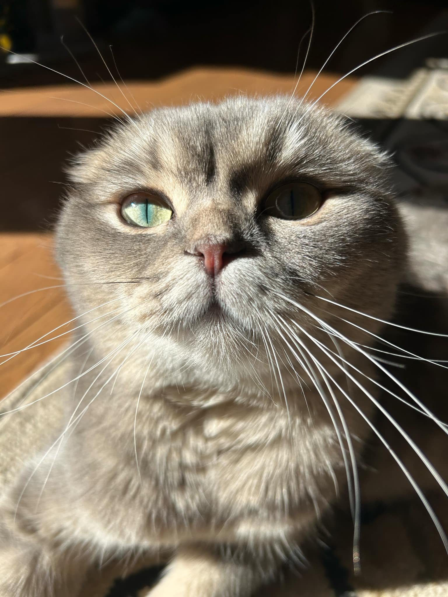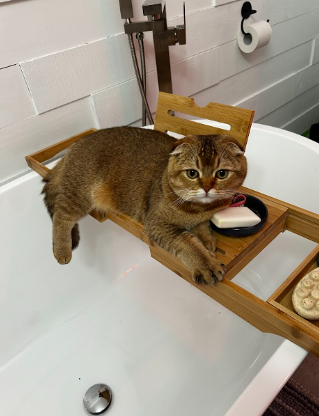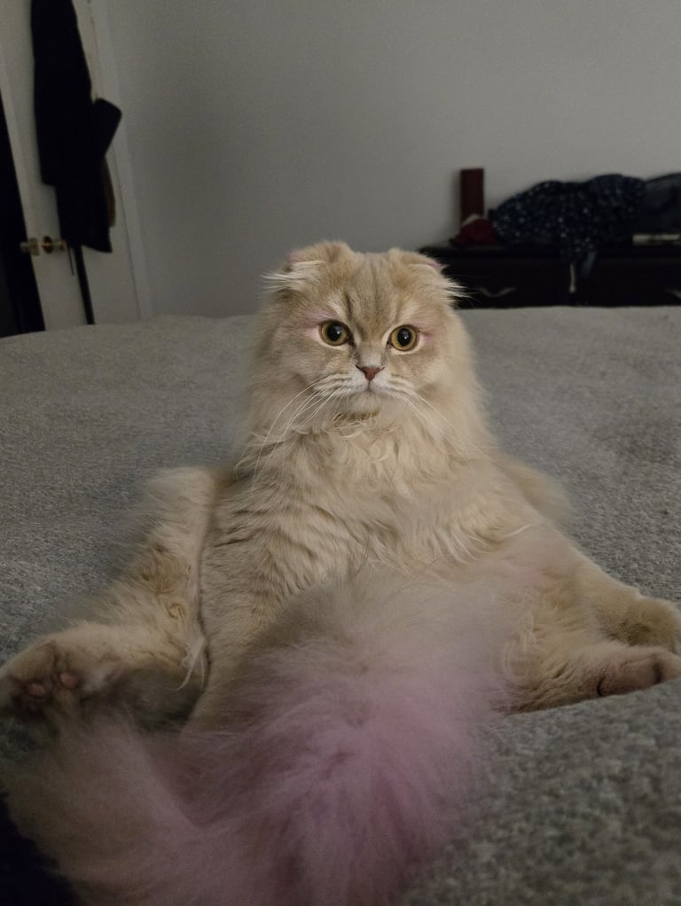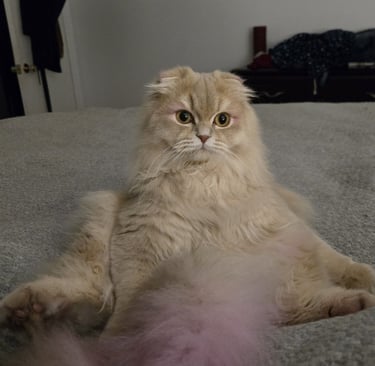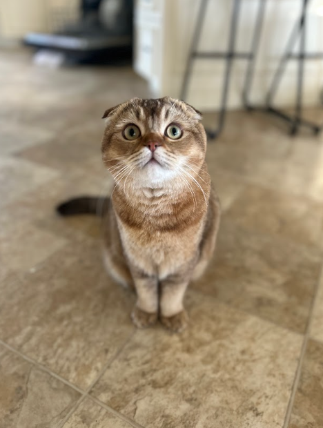 « C'est un bon minou qui se laisse manipuler par son petit gars qui l'adooooore et ne pourrait pu vivre sans elle, sa meilleure amie ! Elle est toujours assit en petit bonhomme sur ses fesses. Elle attire vraiment l'oeil des gens qui viennent chez moi avec ses drôle d'oreilles ! Et elle porte toujours aussi bien son nom. »