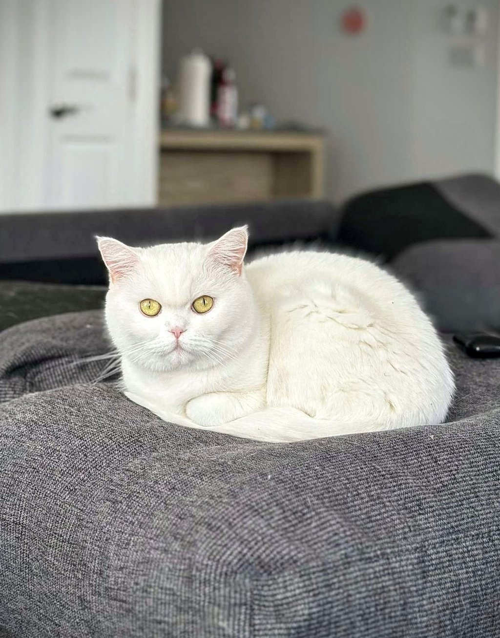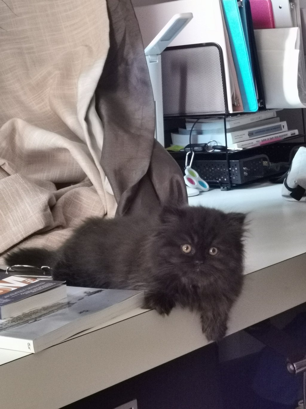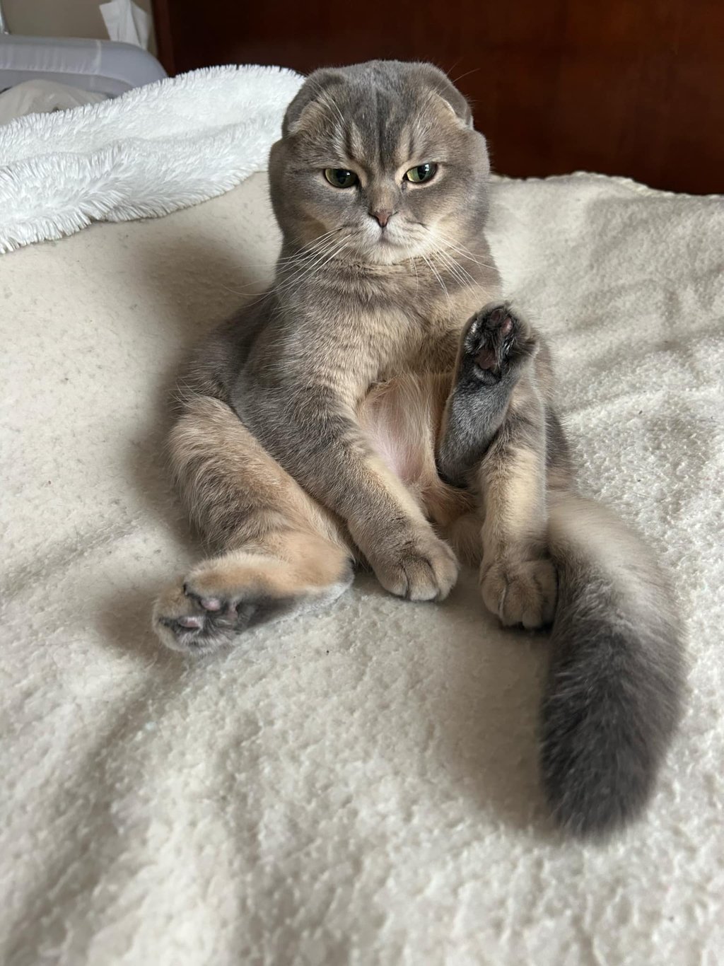 « C'est un bon minou qui se laisse manipuler par son petit gars qui l'adooooore et ne pourrait pu vivre sans elle, sa meilleure amie ! Elle est toujours assit en petit bonhomme sur ses fesses. Elle attire vraiment l'oeil des gens qui viennent chez moi avec ses drôle d'oreilles ! Et elle porte toujours aussi bien son nom. »