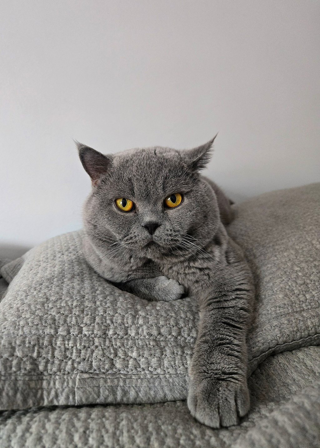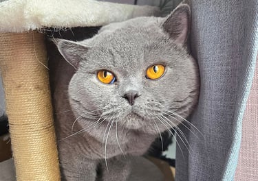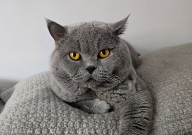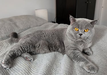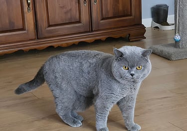 Un majestueux mâle au pelage bleu uni. Son regard orange profond contraste avec élégance sur sa robe soyeuse et uniforme. Venu d'Europe et enregistré TICA, il est issu d’une longue lignée prestigieuse, Duch incarne l’élégance et la rigueur des standards félins les plus raffinés. Son poil extrêmement dense et doux lui donne l’allure d’un petit ours de velours.