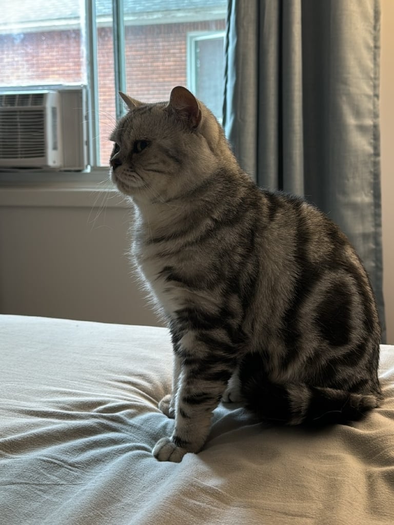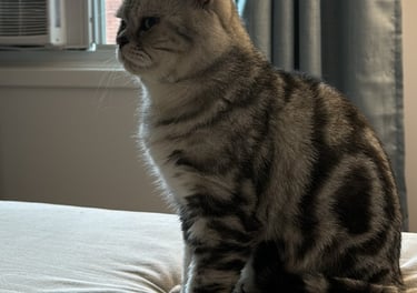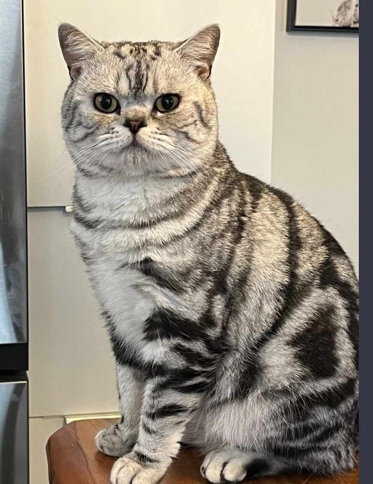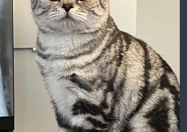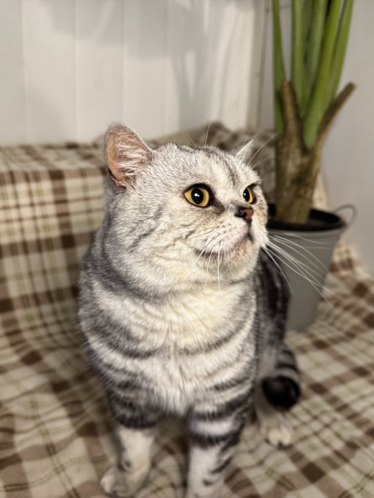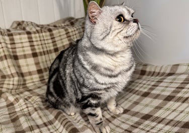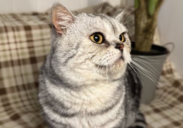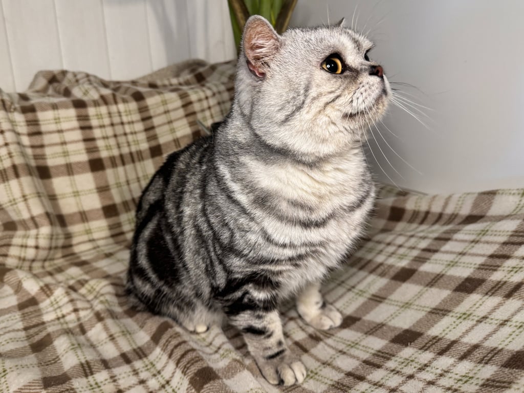 Un élégant mâle Scottish Straight au pelage Black Silver Classic Tabby. Ses spirales sombres parfaitement dessinées sur son fond argenté en font un véritable chef-d'œuvre félin. Ses yeux jaune doré lui donne un élégance naturelle. D'un naturel posé et observateur, M. Potté adore recevoir de l'amour et ne dit jamais non aux caresses.