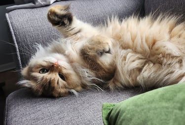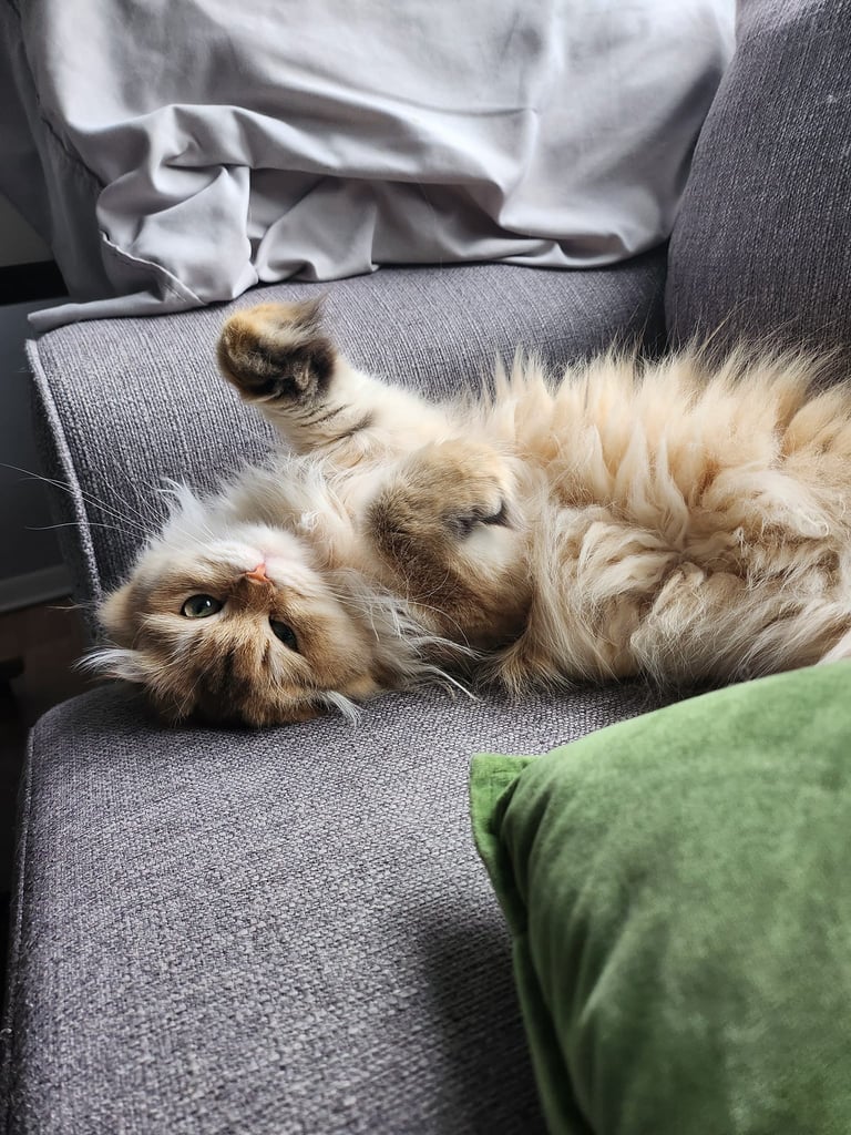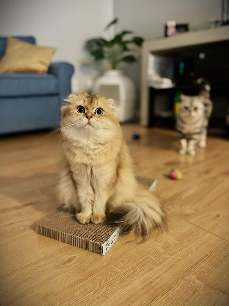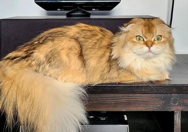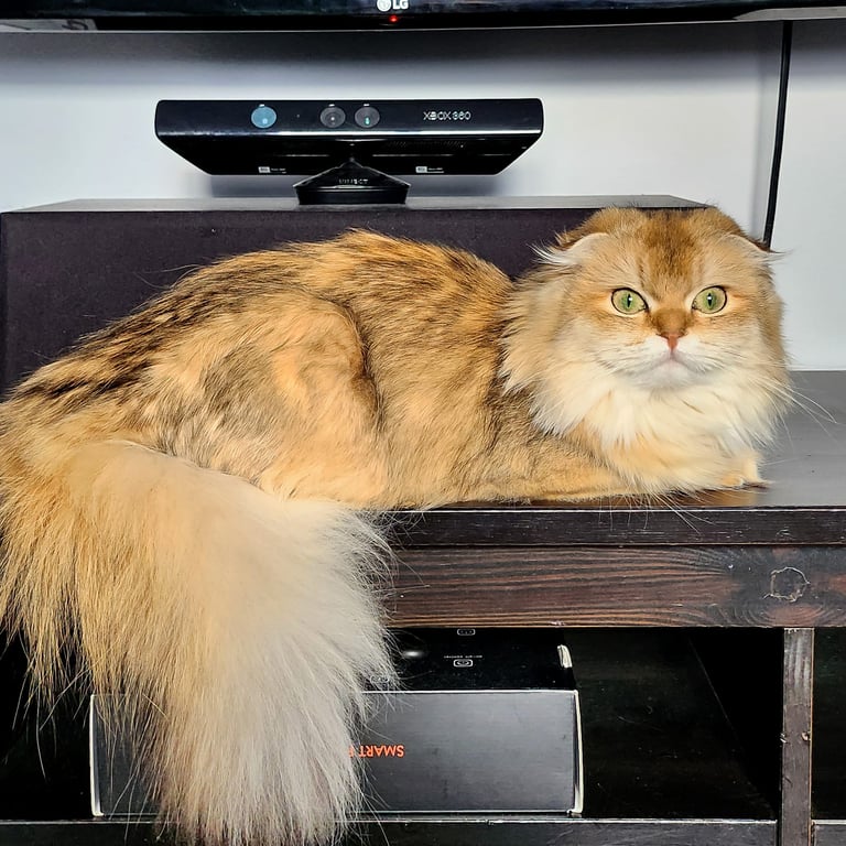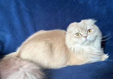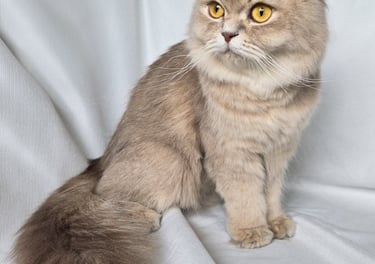 Une adorable femelle Scottish Fold Longhair au pelage Blue Golden Shaded, une combinaison subtile entre des reflets gris bleutés et une base crème dorée. Sa fourrure soyeuse et touffue ainsi que ses yeux dorée nous invite à la câliner. D'un tempérament tendre et affectueux, Rosie est un vrai petit cœur sur pattes. Elle adore être collée à son humain.