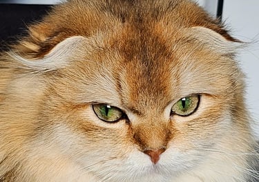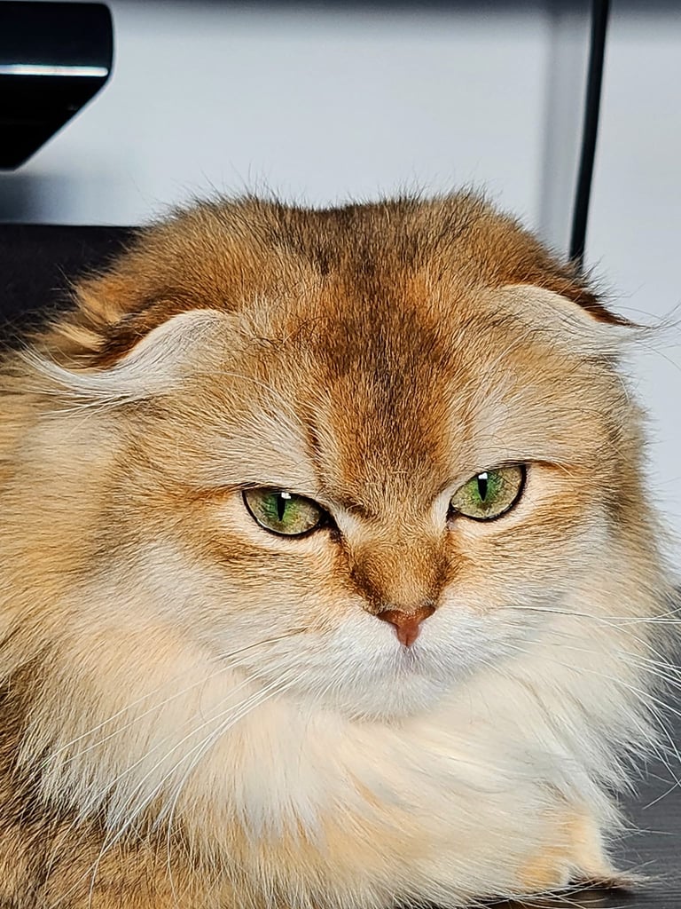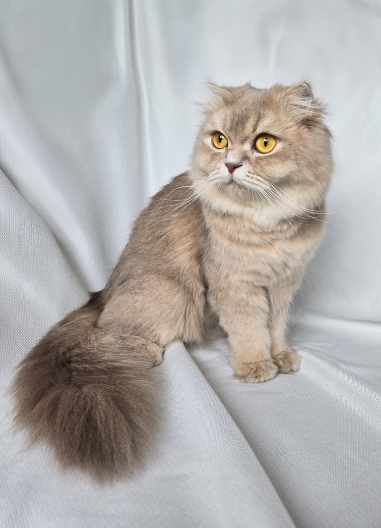 Une magnifique femelle Scottish Fold Longhair, au pelage Chinchilla Golden. Avec ses grands yeux de or à vert, elle sait nous charmer. Fée est d'un tempérament calme et affectueux. Elle apprécie les câlins, mais à sa manière : avec elle tout est une question de tendresse. Fée incarne à merveille la grâce et la douceur de la race Scottish Fold.